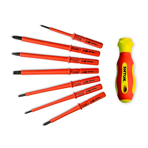 Набор диэлектрических отверток со сменными вставками 7+1 в кофре SHTOK 09345 изготовлен из прочного сплава SVCM с твердостью материала 58-60 HRC. Инструмент можно использовать при работе в сетях под напряжением: имеется VDE-изоляция до 1000 В. Удобство набора заключается в наличии семи стержней под одну рукоятку. Форма повторяет контуры ладони и не вызывает усталости даже при длительной работе.