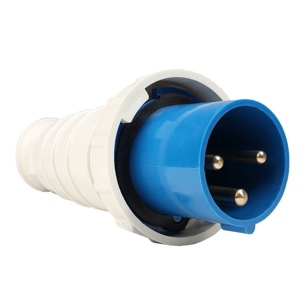 Силовая вилка 3 полюсная на номинальный ток 63 А и рабочее напряжение переменного тока 220 В.