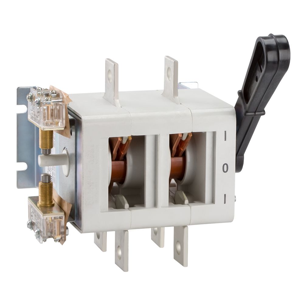 Выключатель-разъединитель 2 полюсный на номинальный ток 630 А, в котором установлена несъемная рукоятка.