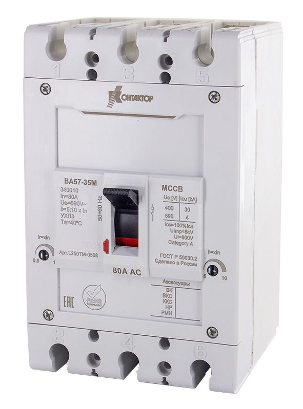 ВА57-35М – серия автоматических выключателей на токи от 16 до 250 А, с номинальным напряжением до 690 В переменного и 440 В постоянного тока, с предельной отключающей способностью до 42 кА (при 400 В). Имеет исполнения с регулировкой теплового и/или электромагнитного расцепителя, без теплового расцепителя. Сопровождается широкой линейкой аксессуаров.
